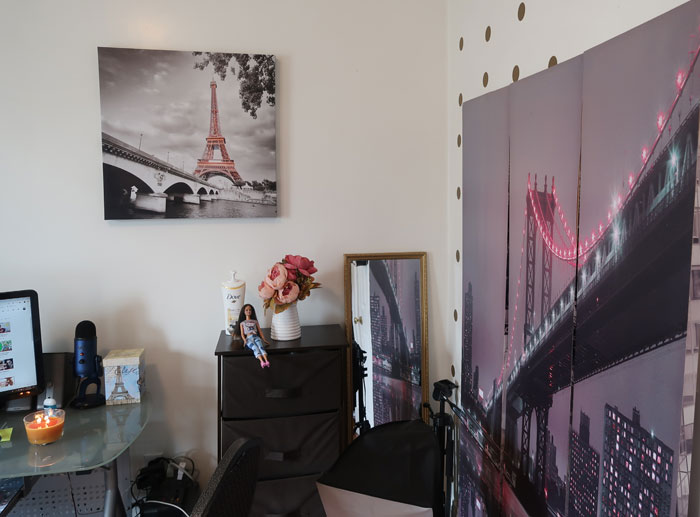 Hola, bienvenidos a mi oficinita y set de filmar videos para mis dos canales de YouTube. Aquí también veo tele, películas en Amazon Video y Netflix, edito los videos, trabajo en mi negocio, tengo una impresora maravillosa, un mueble muy cómodo, un closet donde guardo cosas para grabar y trabajar, en fin, este es mi espacio deseado que orgullosamente quiero mostrar aquí.