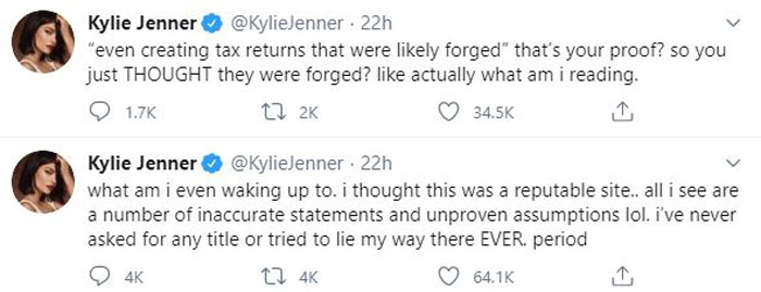 Como era de esperarse, Kylie reaccionó en su Twitter negando la investigación de Forbes. “Pensé que este era un sitio de buena reputación. Todo lo que veo son una serie de declaraciones inexactas y suposiciones no comprobadas. Nunca solicité ningún título o mentí”.