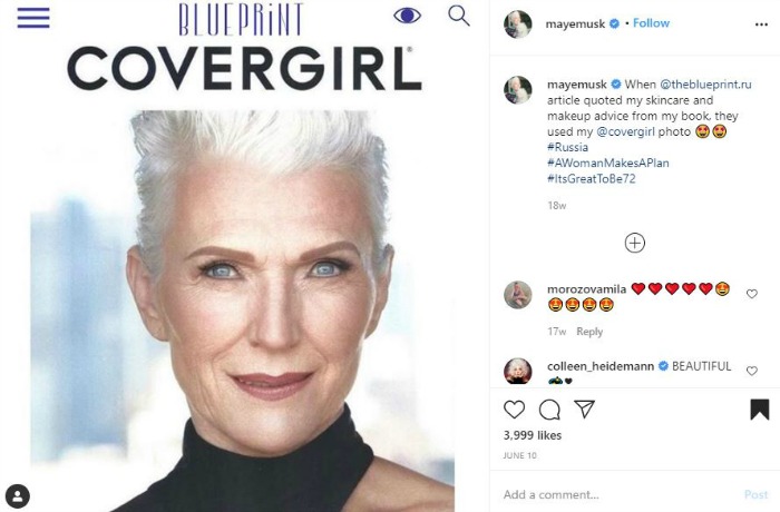 En el 2017 a los 69 años, Maye Musk logró ser una CoverGirl.