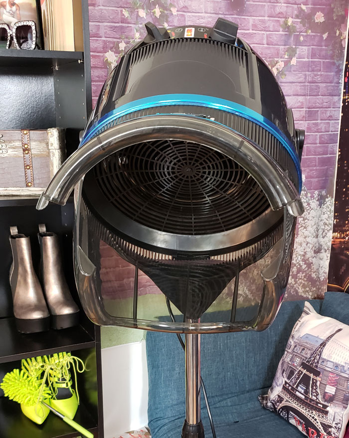 Este secador fue fácil de montar, aunque no trajo instrucciones. Puedes acomodarlo al tamaño que te convenga y como tiene ruedas, puedes moverlo sin problemas. No es muy ruidoso y mientras esperas que se seque el cabello, puedes usar el tiempo para leer, escuchar algún podcast, ver un capítulo de tu serie favorita, escribir, o lo que quieras.