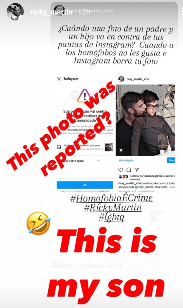 No solamente se siente discriminado por la gente, sino también por la plataforma, ya que una foto en la que aparece el besando a su hijo, fue considerada inapropiada y borrada por el app, así las cosas, algo que sorprende saber, Instagram apoya mucho a los que son como Ricky Martin, hasta tiene empleados en cargos importantes que comparten las preferencias del cantante, ¿será que hubo algún error?