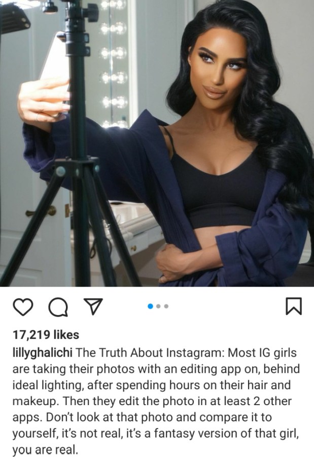 Lilly Ghalichi, una reality star que se dio a conocer en Shahs of sunset, publicó un post en su IG diciendo que las chicas de Instagram usan un app mientras se fotografían, y que aparte de que ya tienen maquillaje puesto, usan luces especiales, y una vez escogida la foto para compartir, usan dos editores adicionales para perfeccionar la imagen (segurito eso mismo hace ella y por eso sabe tanto). Ella misma se contradijo, y es evidente que en esta foto y en todas las que aparecen en su feed post, siempre usa la magia de los editing apps. Lilly, si en verdad querías dar un mensaje sincero, debiste mostrarte al natural.