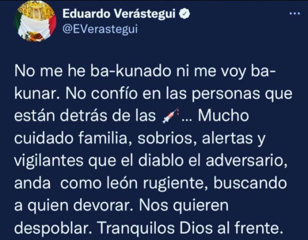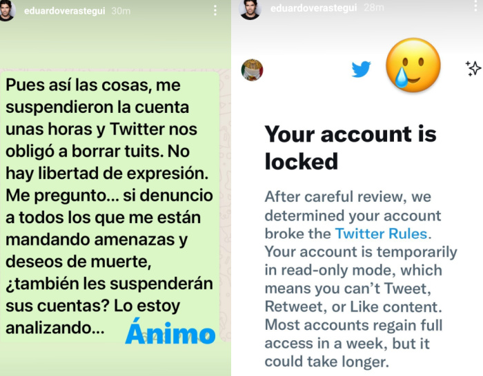 Luego de la suspensión de su cuenta, Eduardo volvió a tener acceso a ella y escribió: ¡El tiempo lo dirá! Por ahora, en tiempos de mentira universal, decir la verdad, es un acto revolucionario. ¡Buenas noches familia! #Ánimo
