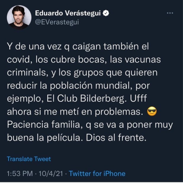 Eduardo Verástegui fue forzado por Twitter a borrar dos tweets que había compartido y que obviamente van en contra de la opinión de la plataforma.