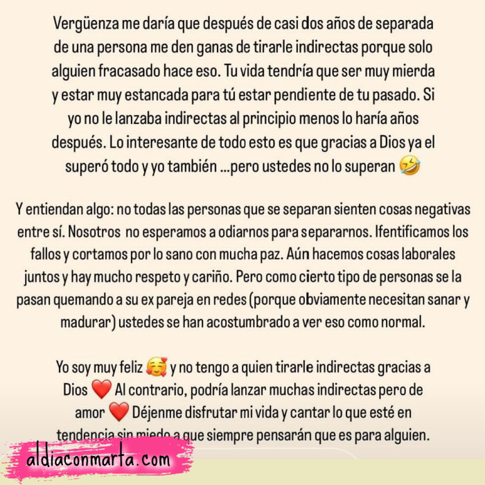 Yarissa, inmediatamente le contestó con un post de tres párrafos aclarándole que a estas alturas ella no haría tal cosa, y menos después de casi dos años de estar separados.