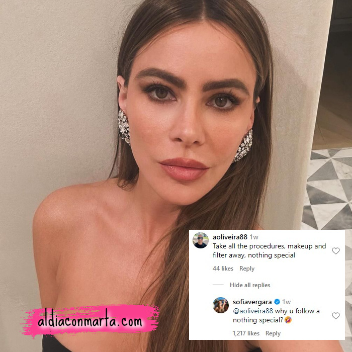 Esto le escribió un hombre dolido, quién sabe porqué razón, a Sofia Vergara en uno de sus posts en Instagram, y la famosa actriz inmediatamente le respondió con un emoji burlón de que si ella no era especial, ¿por qué entonces él la seguía? Momento después, el individuo le aseguró que no la seguía y al mismo tiempo se contradijo.