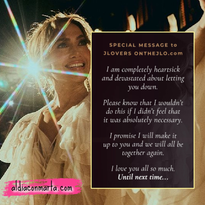 J.Lo informó que el motivo de la cancelación de su tour es para poder compartir más tiempo con su familia y confiesa sentirse devastada por no poder cumplirle a los que sí estaban dispuestos a verla en vivo, aunque los venenosos juran que no canta y por eso usa playback.