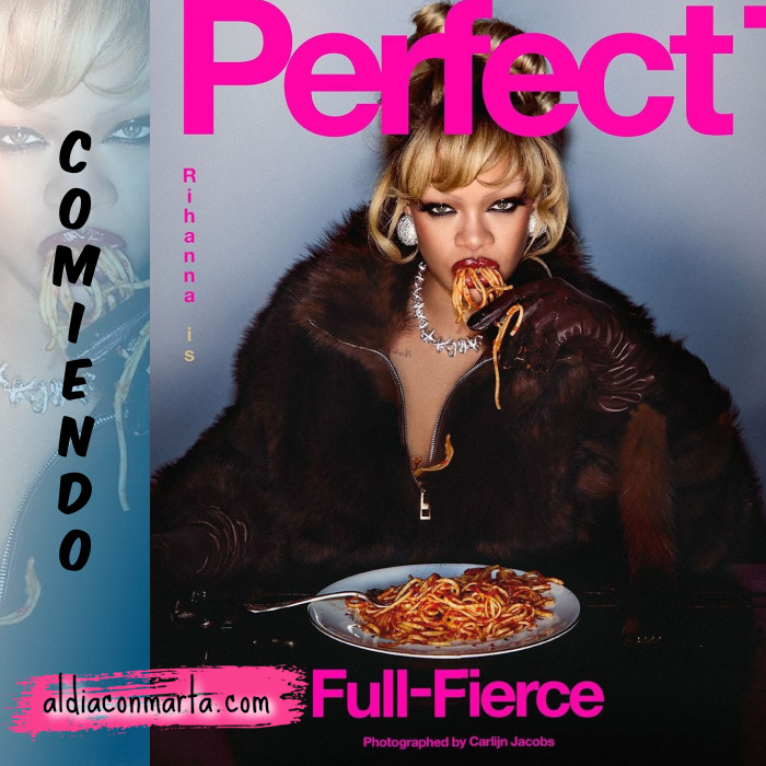 En su portada vemos a la sobrevalorada cantante Rihanna, muy arreglada y maquillada devorando un plato de spaghetti. Para muchos, ver a alguien comer o con la boca llena, les resulta ofensivo.